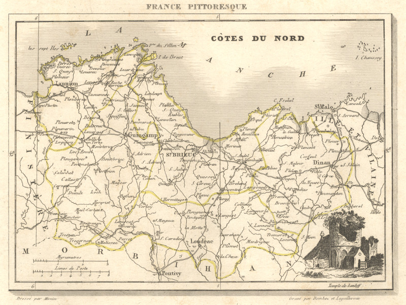 A map of the departement Cotes-d'Armor, formerly Cotes du Nord, from "France Pittoresque" by A. Hugo. With hand coloured borders and an image in the corner of the Temple of Lanleff.