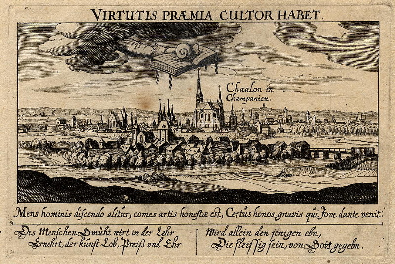 Antique view Virtutis praemia cultur habet (Chalons-en-Champagne in France) | ||||||||||||||||||