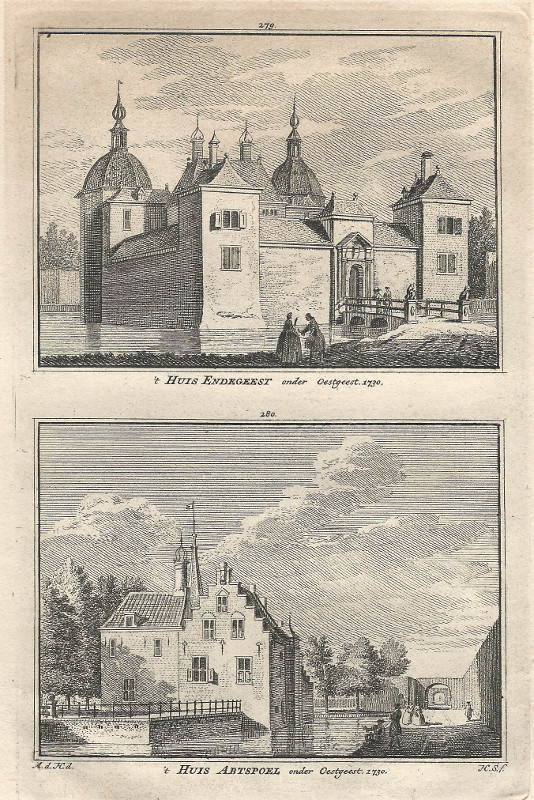 Antique view ´t Huis Endegeest onder Oestgeest 1730, ´t Huis Abtspoel onder Oestgeest 1730 (Oegstgeest in Zuid-Holland) | ||||||||||||||||||